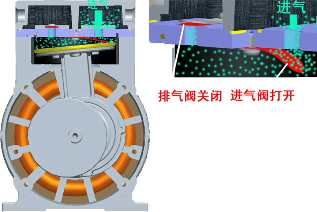 定子進排出口分離開來,周而復(fù)始運轉(zhuǎn),進行變?nèi)荩瑢⑽霘怏w,從排氣口排出,從而達到抽氣目的。